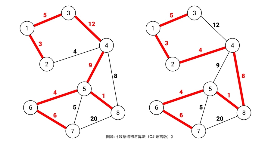 对于加权图,每条边都有权重,所以每棵生成树都有一个权重和。比如上图,右侧生成树的权重和显然比左侧生成树的权重和要小。