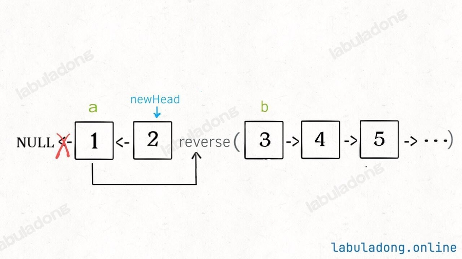 「反转以 a 为头结点的链表」其实就是「反转 a 到 null 之间的结点」,那么如果让你「反转 a 到 b 之间的结点」,你会不会?