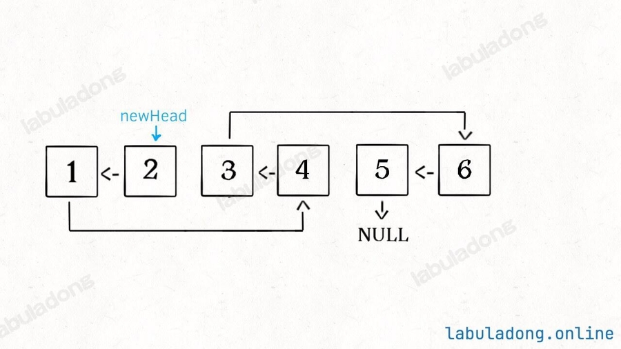 我们可以直接递归调用 reverseKGroup(cur, 2),因为子问题和原问题的结构完全相同,这就是所谓的递归性质。