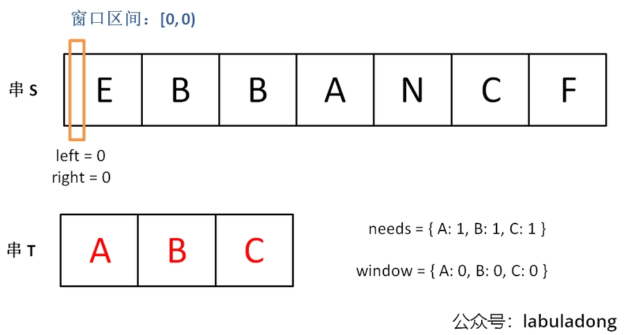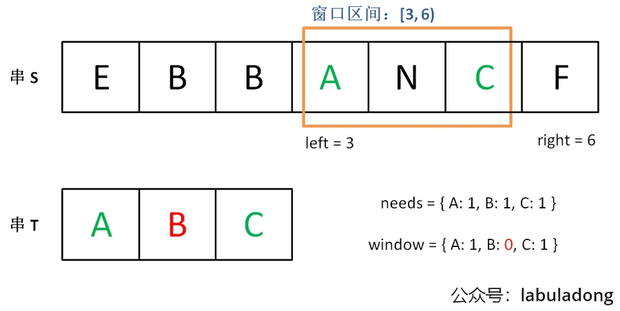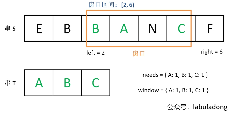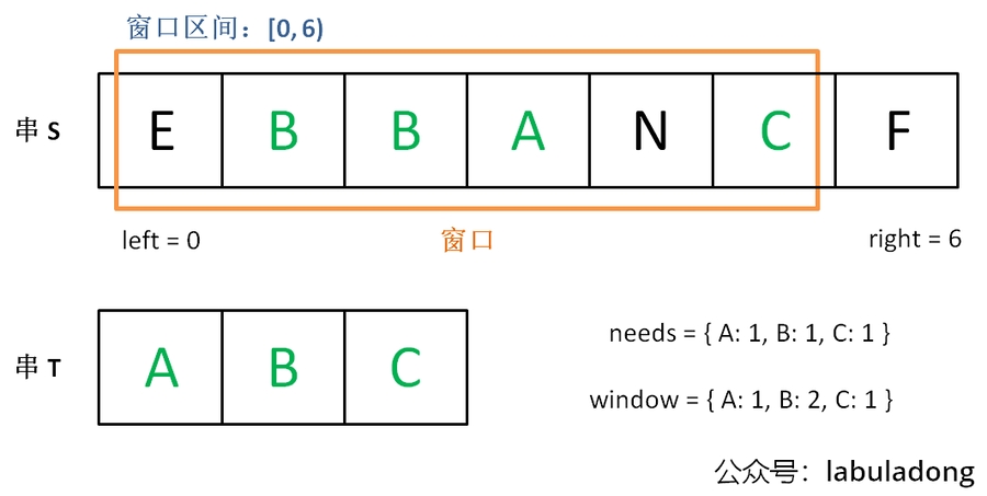 下面画图理解一下,needs 和 window 相当于计数器,分别记录 T 中字符出现次数和「窗口」中的相应字符的出现次数。