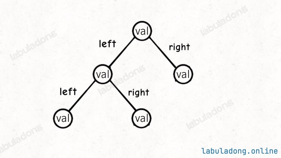 }其中 left, right 存储左右子节点的指针,所以二叉树的结构是这样: