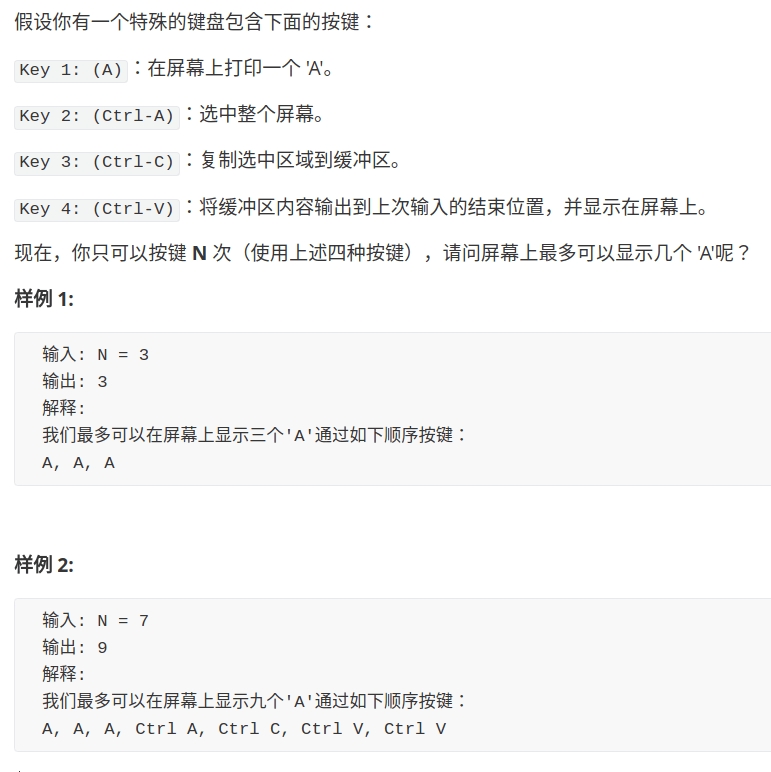 你看我这样定义三个状态行不行:第一个状态是剩余的按键次数,用 n 表示;第二个状态是当前屏幕上字符 A 的数量,用 a_num 表示;第三个状态是剪切板中字符 A 的数量,用 copy 表示。